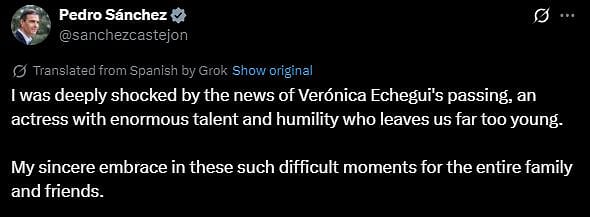 The Prime Minister of Spain, Pedro Sánchez, tweeted, "I was deeply shocked by the news of Verónica Echegui's passing, an actress with enormous talent and humility who leaves us far too young. My sincere embrace in these such difficult moments for the entire family and friends."